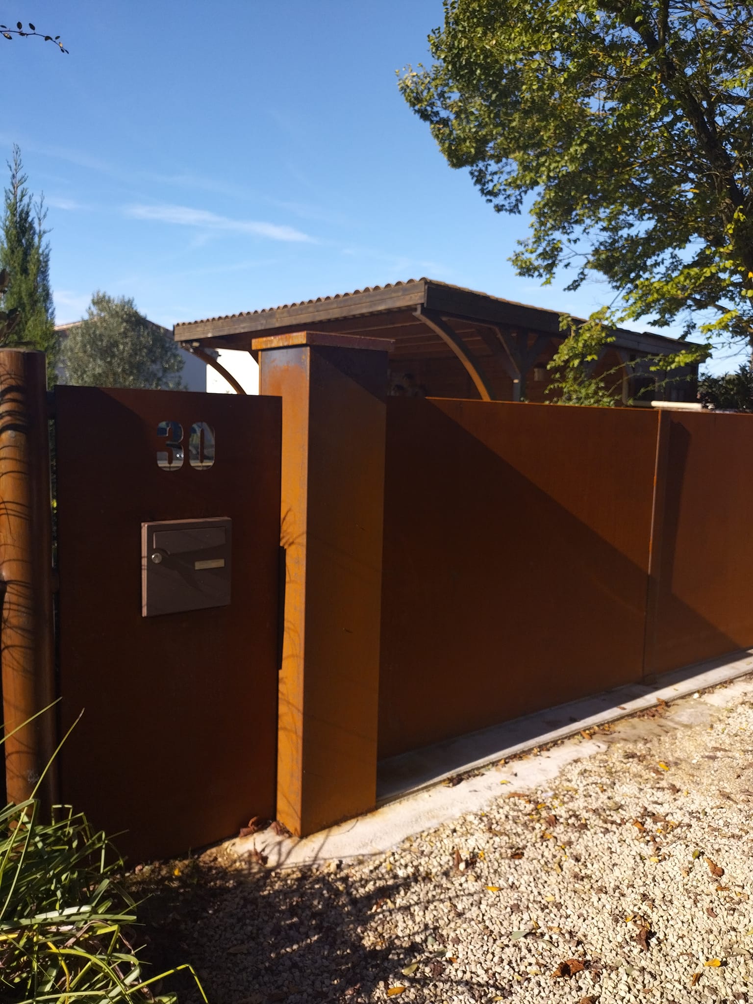 Fabrication et pose d’un portillon en tube carré habillé de tôle pleine avec ouverture pour boite aux lettre et découpe du numéro. Portillon brut, laissé rouillé a l’air puis stabilisé une fois la couleur souhaitée obtenu.
